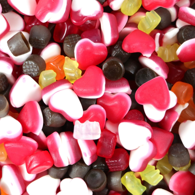 Sötningsmedel (maltitol, erytritol, steviolglykosider från stevia), modifierad stärkelse (potatis, ärta, tapioka), syror (citronsyra, mjölksyra), potatisprotein, kokosolja, aromer, hydrolyserat ärtprotein, färgämnen (ammoniakkaramell, kurkumin, karminer, kopparkomplex av klorofyller), färgande livsmedel (koncentrat av äpple, svartvinbär, morot, rädisa, safflor, spirulina och citron), surhetsreglerande medel (trinatriumcitrat), ytbehandlingsmedel (bivax, vitt och gult, karnaubavax). Kan innehålla gluten (vete). Överdriven konsumtion kan ha laxerande effekt.