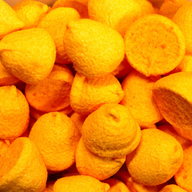 Socker, glukos-fruktossirap, vatten, gelatin, aromer, färgämne: E100, E120.