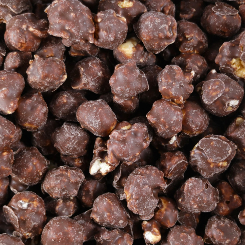 Karamelliserad popcorn (60 %) (socker, majskorn, glukossirap, smör, maltodextrin, kokosolja, vasslepulver, salt, emulgeringsmedel (sojalecitin (E322)), arom (kola)), mjölköverdrag (40 %) (socker, palmkärnolja, kakaopulver, vasslepulver, emulgeringsmedel (E476), vaniljarom). Kan innehålla spår av nötter, jordnötter och gluten. Kan innehålla opoppade kärnor.