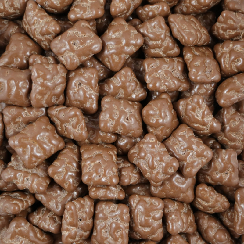 Socker, kakaosmör, helmjölkspulver, vegetabiliska fetter (shea, palm), kakaomassa, vetemjöl, majsmjöl, skummjölkspulver, vasslepulver (från mjölk), fettfattigt kakaopulver, havremjöl, laktos (från mjölk), potatisstärkelse, emulgeringsmedel (SOYLALTLITIN, solroslecitin), salt, VETEMJÖL, aromämnen, MJÖLKMJÖL, ytbehandlingsmedel (arabicum, shellack), glukossirap, naturlig vaniljarom, vegetabiliska oljor (kokos, raps). Kan innehålla hasselnötter och mandel.