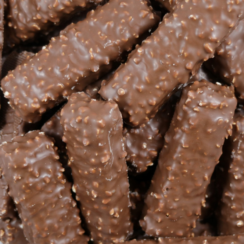 Glukoosisiirappi, sokeri, kasvirasvat (palmu, shea), rasvaton MAITOJAUHE, kaakaovoi, MANTELIT, TÄYSMAITOJAUHE, kaakaomassa, kaakaojauhe, herajauhe (MAITO), hydrolysoidut MAITOPROTEIINIT, suola, emulgointiaine (lesitiinit), aromit (mm. vanilliinia), heraproteiini (MAITO). Saattaa sisältää HASSELPÄHKINÄÄ. Maitosuklaa sisältää kaakaovoin lisäksi muita kasvirasvoja.