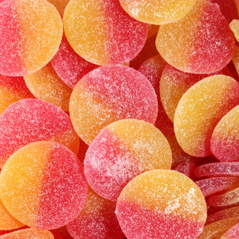 Sokeri, glukoosisiirappi, liivate, happamuudensäätöaineet (E296, E330), aromit, värit (E120, E160a), pintakäsittelyaine (E903).